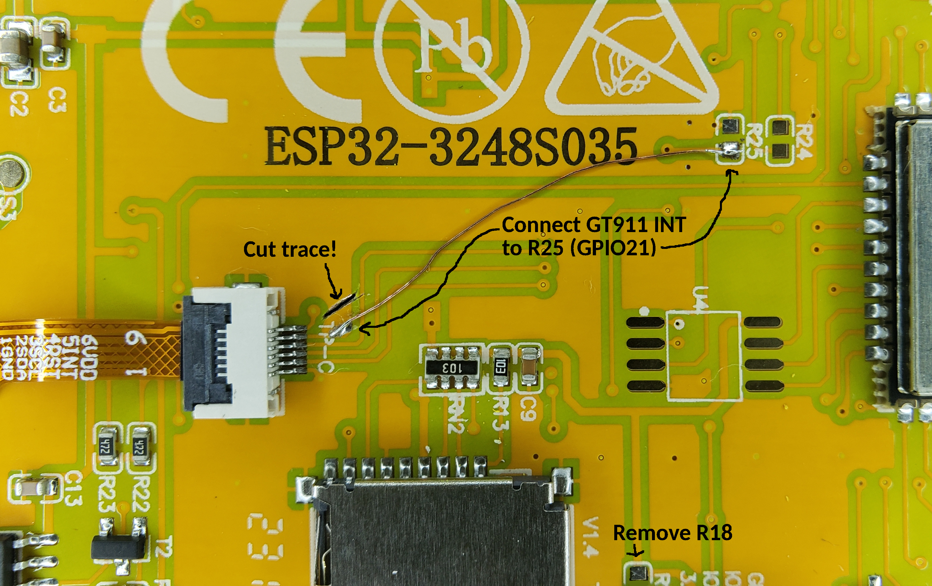 - Remove (pull-up) resistor R18 (GPIO21 to 3V3). The GT911's INT pin is not strong enough to drive GPIO21 low with this resistor installed.