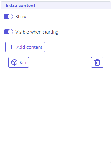 The extra content can be set to "Show" to control the visibility of the panels and pages. The setting "Visible when starting" only affexct extra content that is displayed on the Dashboard. This allows users to manage the display extra content based on their preferences and workflow needs.