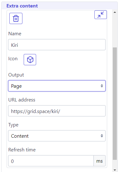 To modify an existing extra content , click on the content button you wish to update. This will open the configuration interface, where you can make changes to the name, icon, output, URL, type, and refresh time.