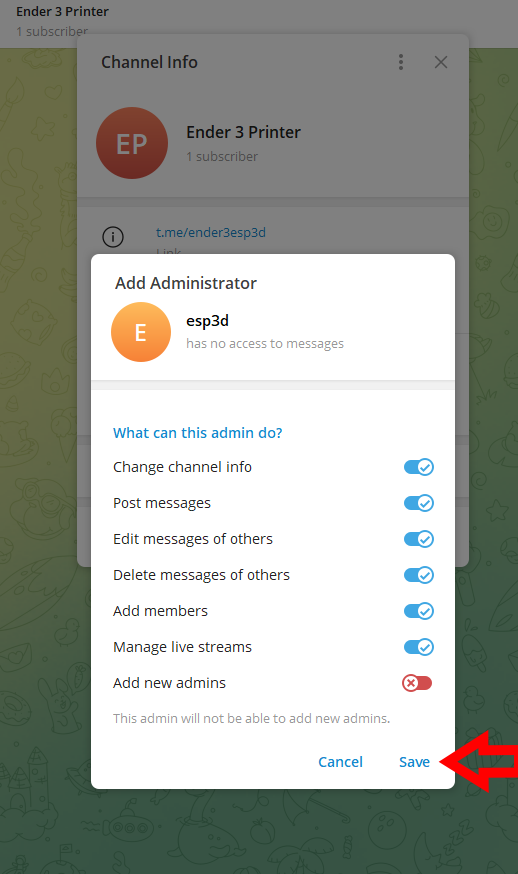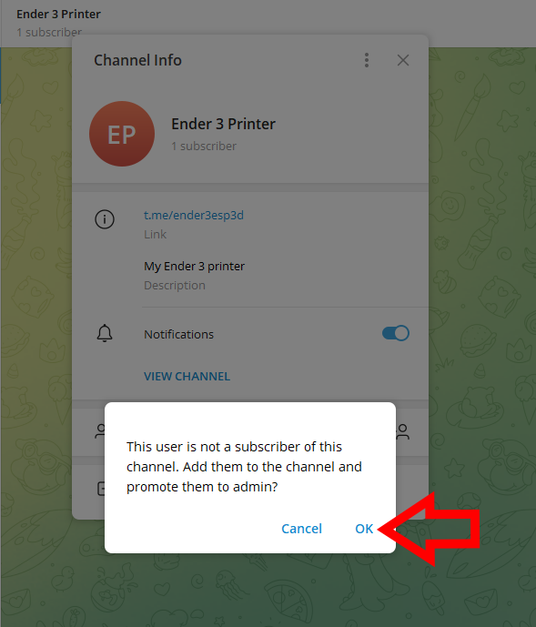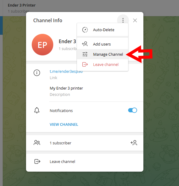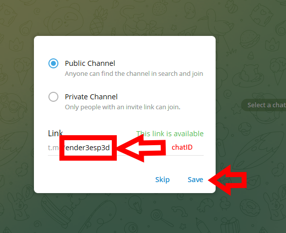 [ESP610]type=TELEGRAM T1=<bot token> T2=<@chatID> (for channel)