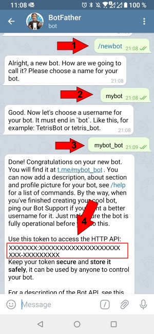 Copy this url into your browser and modify it with your bot's token https://api.telegram.org/bot<TOKEN>/getUpdates?offset=-1You can quickly find your numeric chat idT2=<numeric chat id>