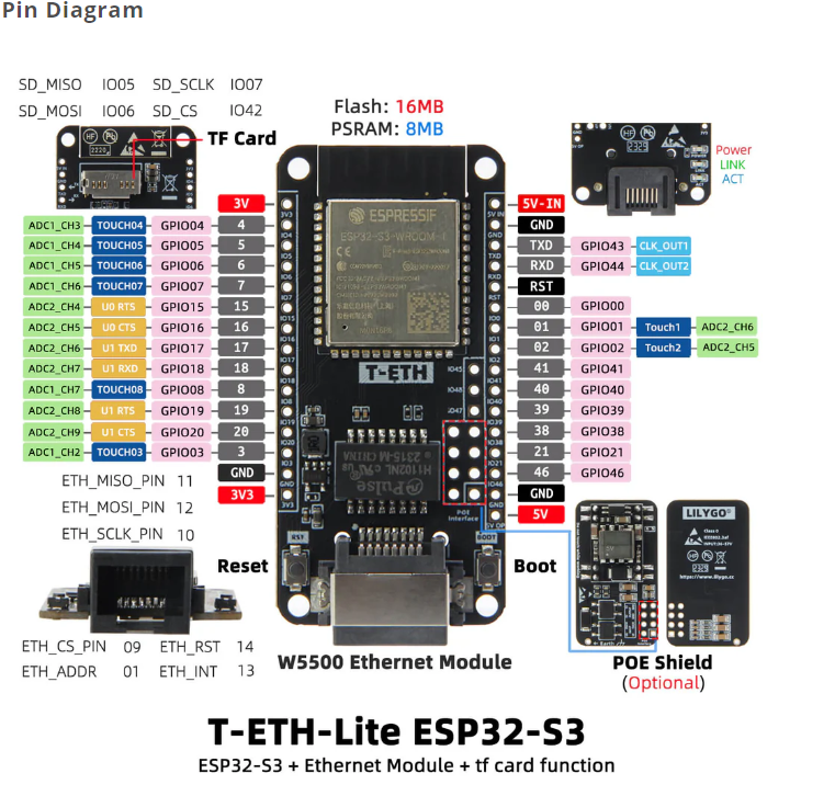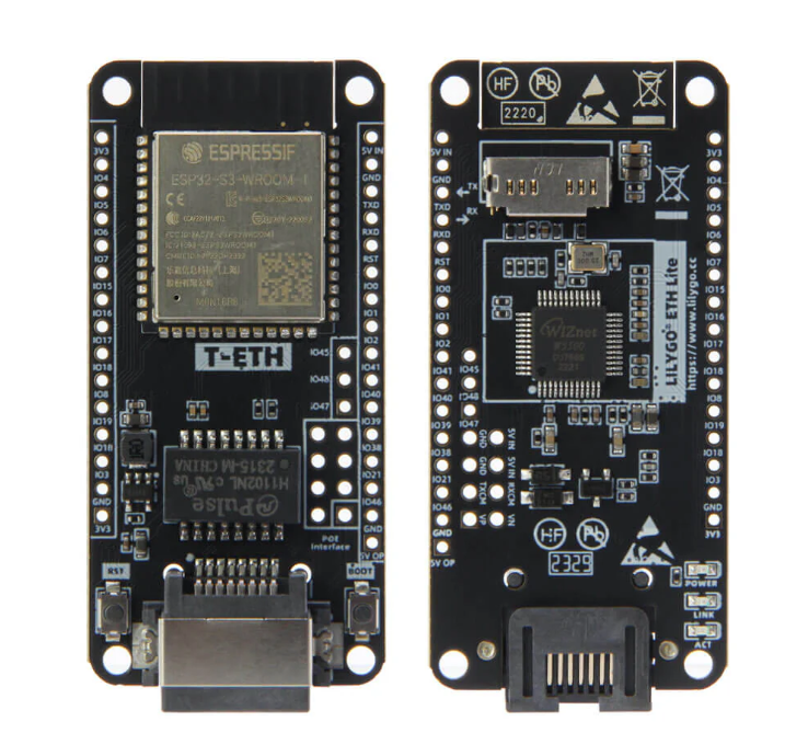 - ESP32 with 16MB flash memory and 8MB PSRAM (OPI), Micro SPI Card reader, ceramic antenna, RJ45 ethernet port