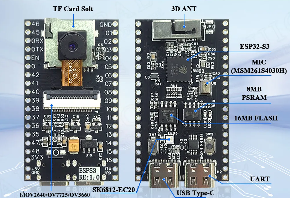 - ESP32-S3 with 16MB flash memory, 8MB PSRAM (qspi), 3D antenna, RGB led, Camera and SD card reader (SDIO 1bit)