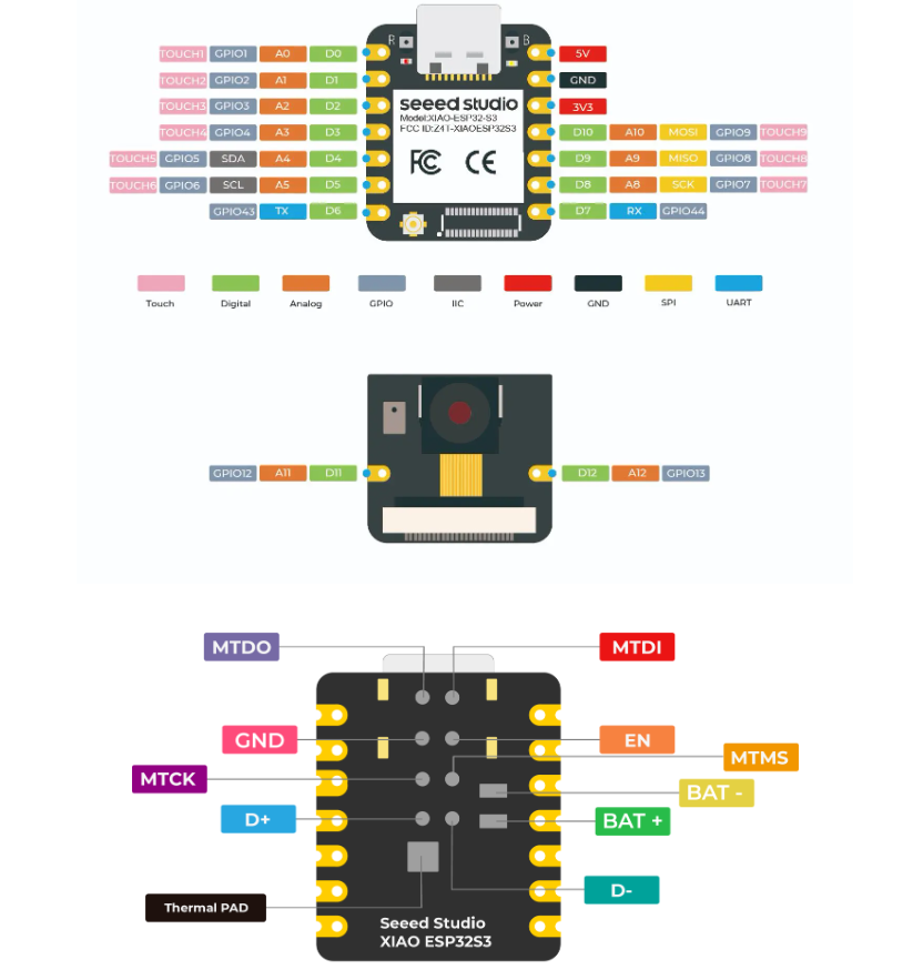 - ESP32-S3 with 8MB flash memory, 8MB PSRAM (opi), ipex connector antenna, oV2640 camera, Digital Microphone, SD Card reader