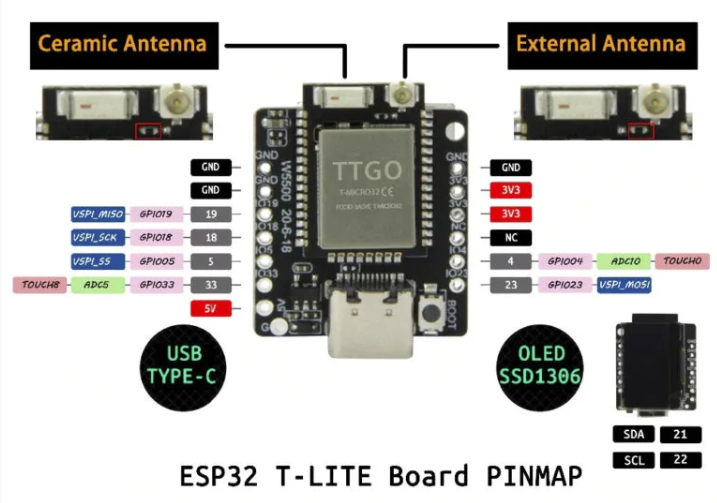 - ESP32 with 4MB flash memory, external and ceramic antenna, SSD1306 screen and SPI ethernet