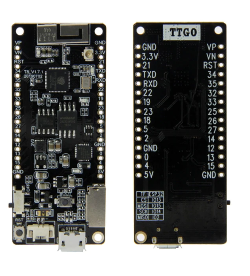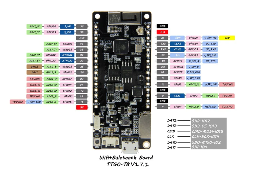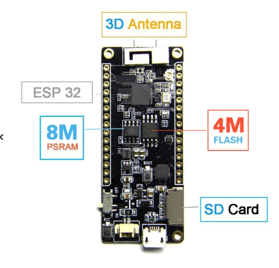 ESP32 with 4MB flash memory, 8MB PSRAM, ceramic antenna, SD card reader (SPI and SDIO)