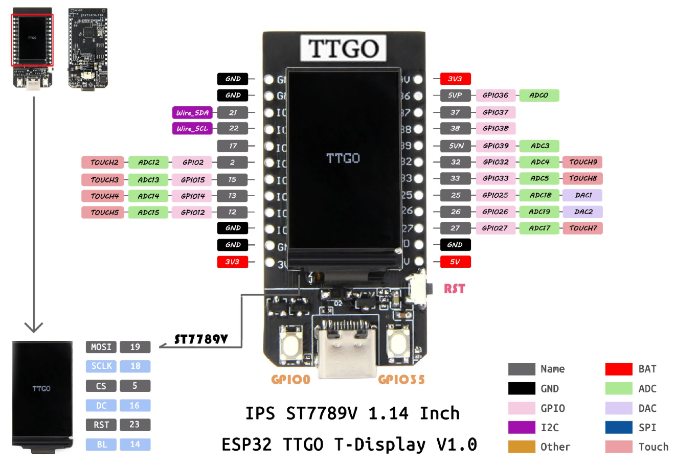 ESP32 with 4MB flash memory, ceramic antenna, SPI 135x240 ST7789V IPS screen )